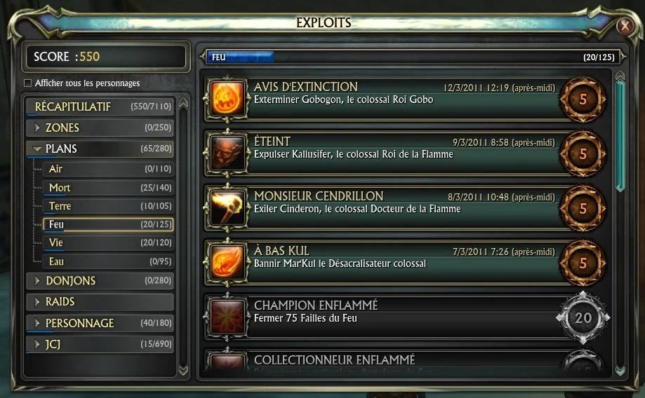 - Exploits de Personnage : exploits accomplis lors de la progression de votre personnage