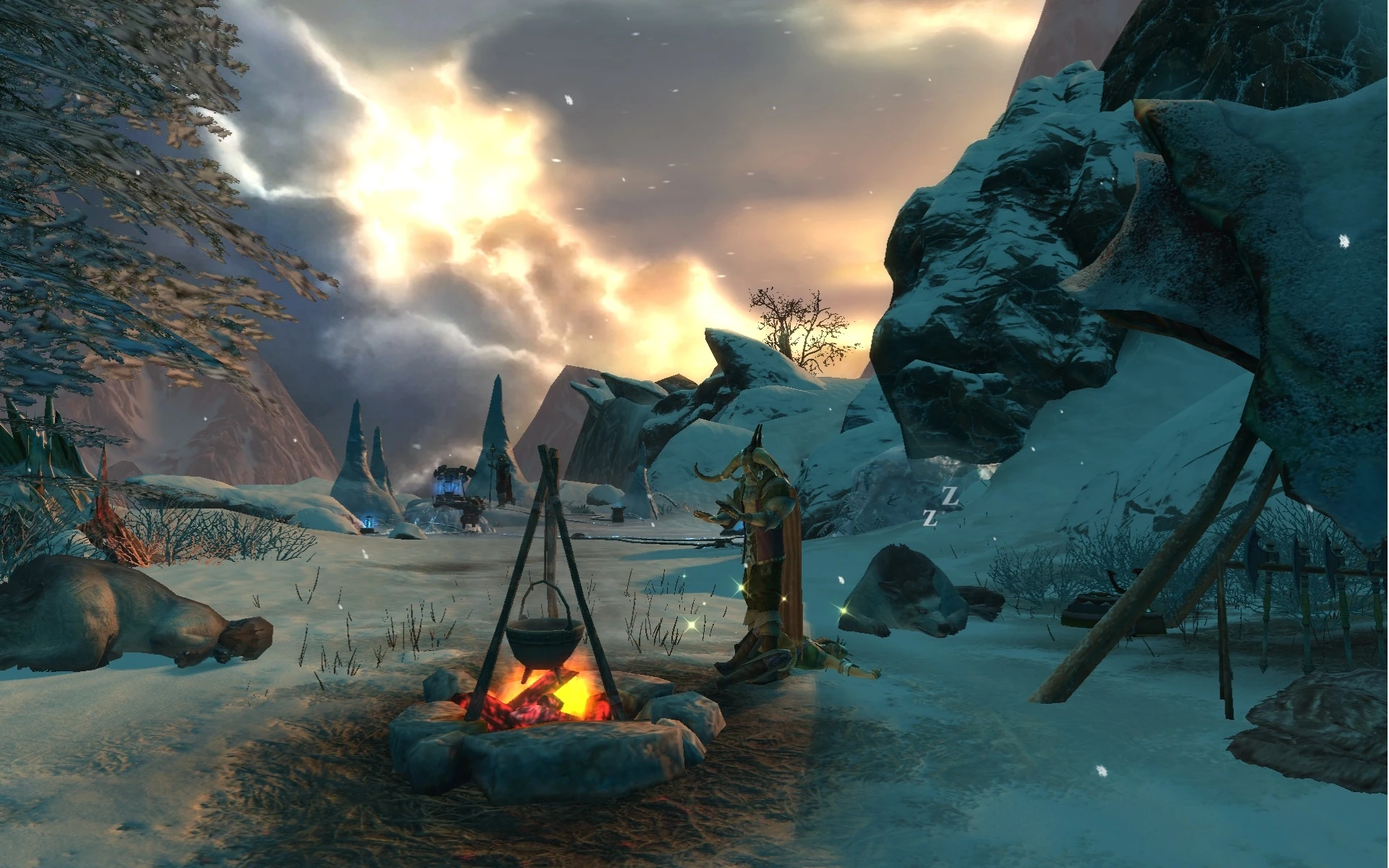 This vista chills the blood of bold explorers, while encouraging the mountain’s new full-time occupants to redouble their wicked efforts. These cultists of Akylios find the seemingly bottomless expanse almost comforting, a reminder that if their schemes in Iron Pine are successful, all of Telara will be swallowed in cold, roiling chaos for them to rule over.